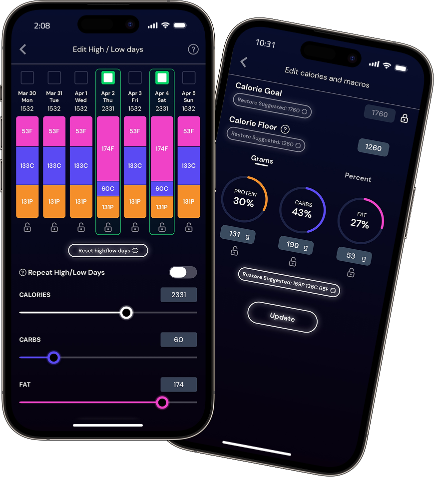 Fine tune each day with the improved High / Low Days feature with settings for each day. Take out all of the guesswork when planning macros for the week.